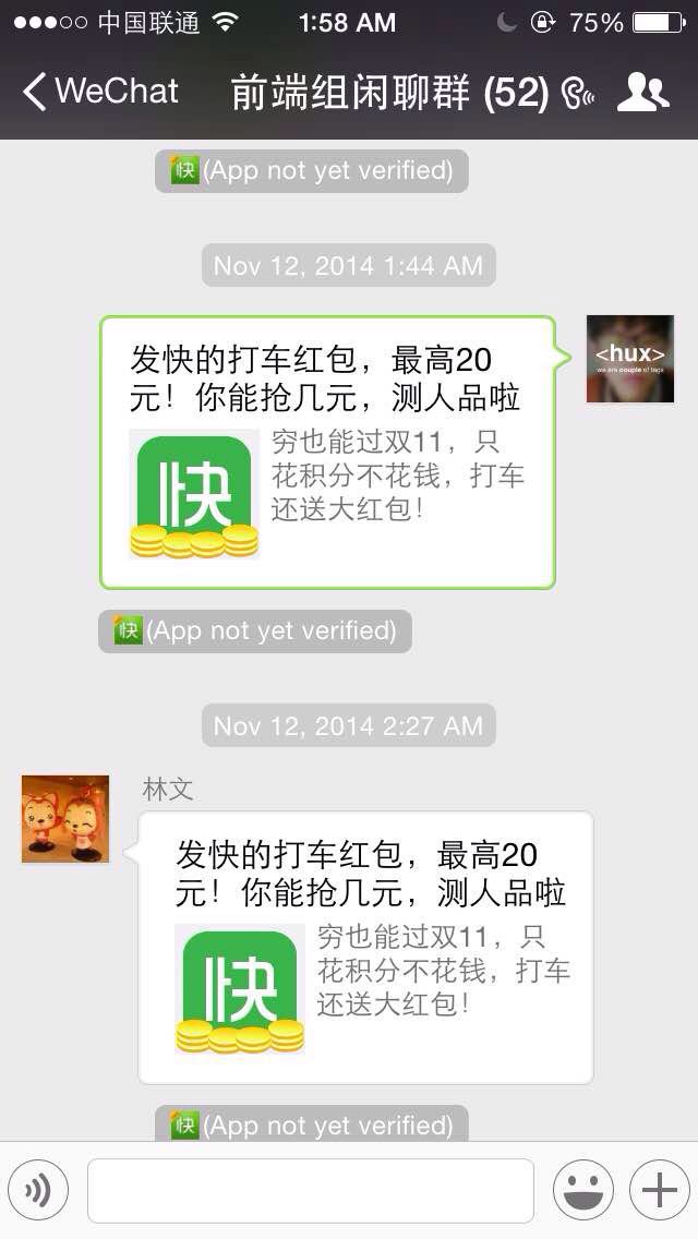 于是,每天 9 ~ 12 点间,公司里的叫车声、电话约车声、络绎不绝。我们团队私下里也有个微信群,用以和工作的旺旺群区分。在打车软件玩起红包返现后,大家就都会在群里分享叫车红包,52个人的群,有时一分钟内不抢,红包就没了。